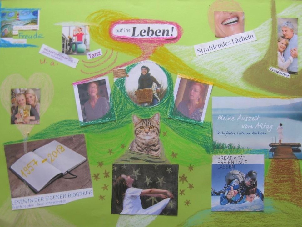 Ausdrucksmalen und eine Visionscollage (am WE) unterstützen den Prozess des Erkennens. Ich kann Gefühle bzw. Wünsche ausdrücken, wahrnehmen, in eine Zukunft hineingestalten und so ein Visionsbild entstehen lassen, das mich durchs Leben leitet.